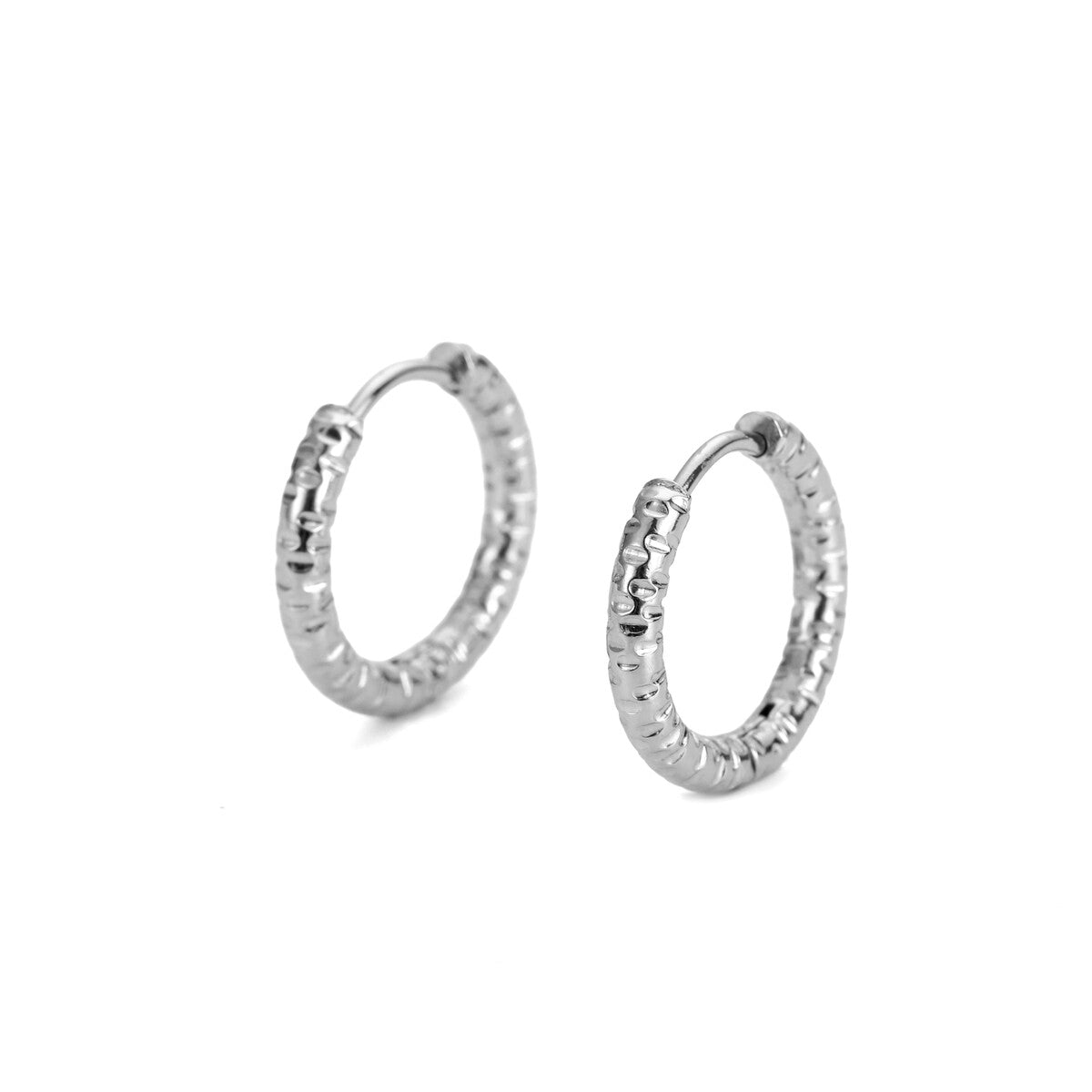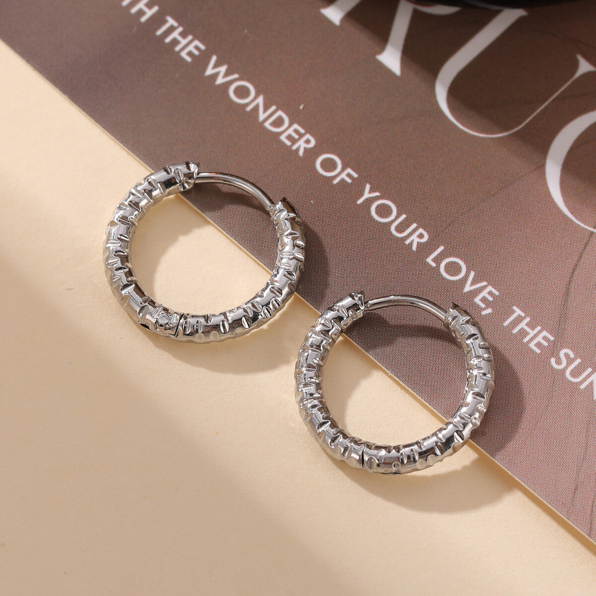 La paire de boucles d'oreilles JULIA en acier inoxydable est conçue pour durer, avec une garantie sans nickel, sans cadmium et sans plomb. Le motif martelé ajoute une touche d'éclat et la résistance à l'eau vous permet de les porter en toute occasion sans risque de ternissement.