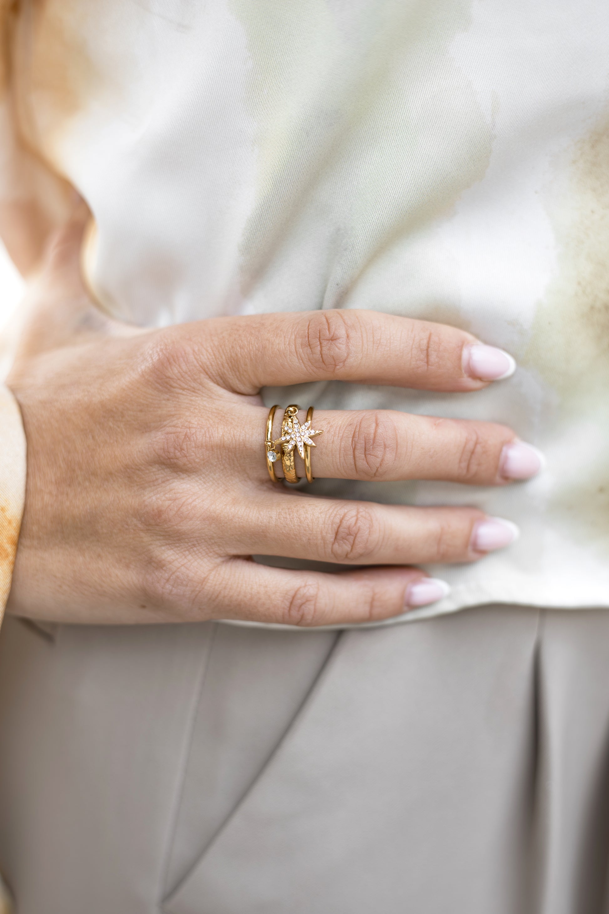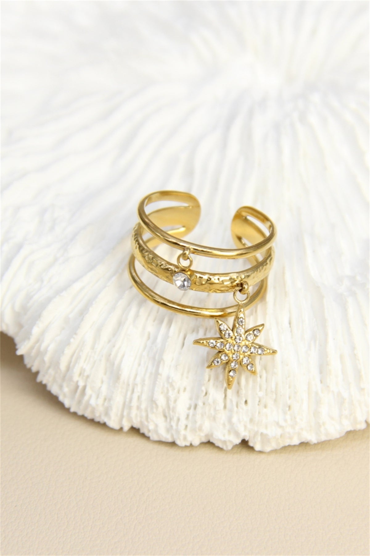 Faites briller vos mains avec cette bague dorée chic et raffinée. Son design à double anneau martelé accueille deux charms suspendus : une étoile scintillante incrustée de strass et un petit cristal pour un effet lumineux irrésistible.